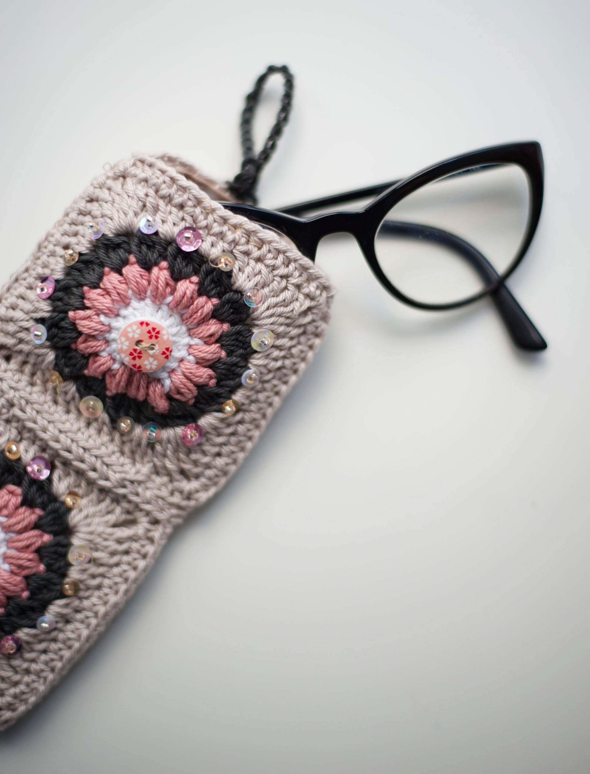 Handmade crocheted pouch for glasses, with fabric plaid inside, decorated with beads, closing with the matching button.