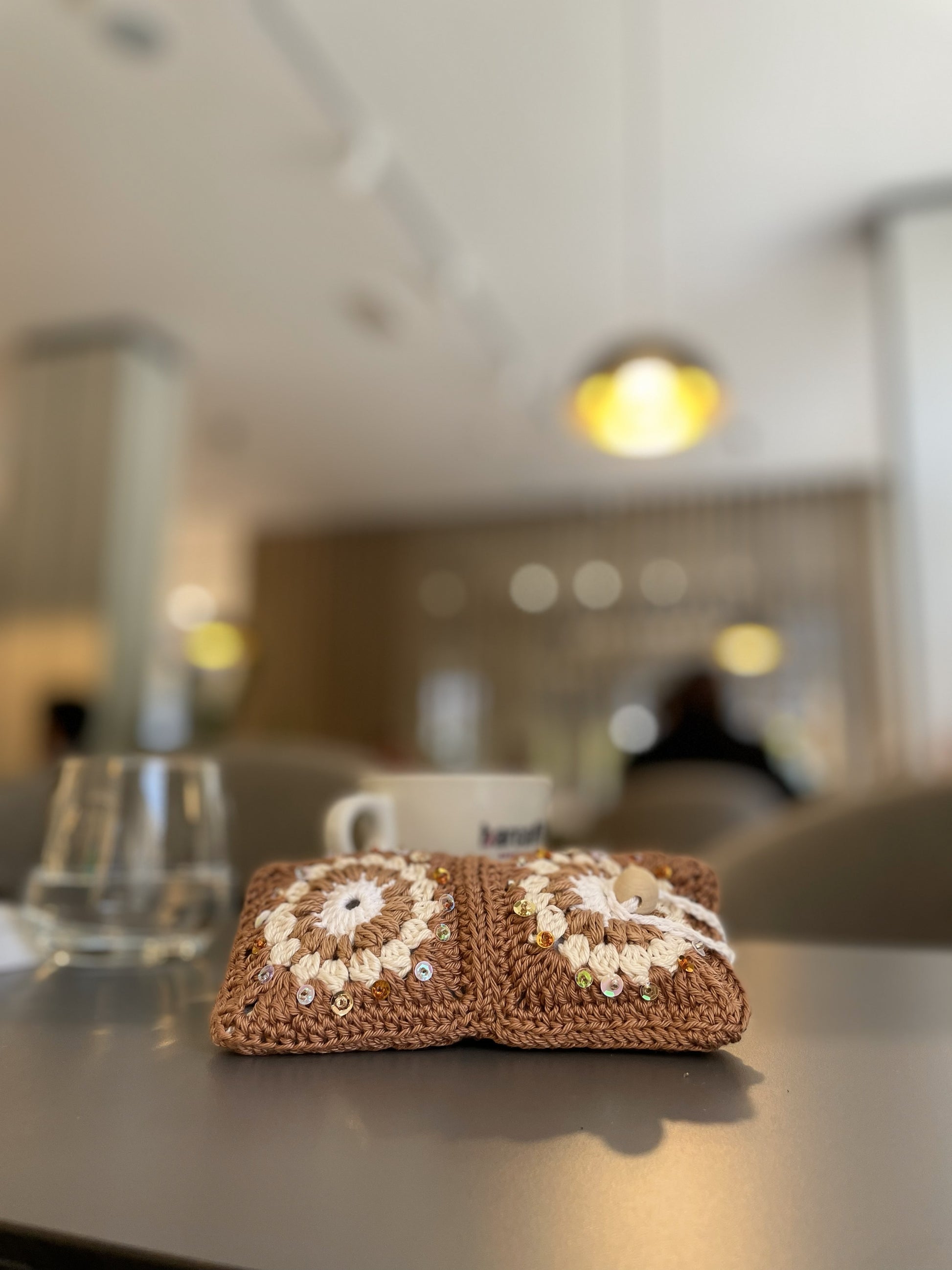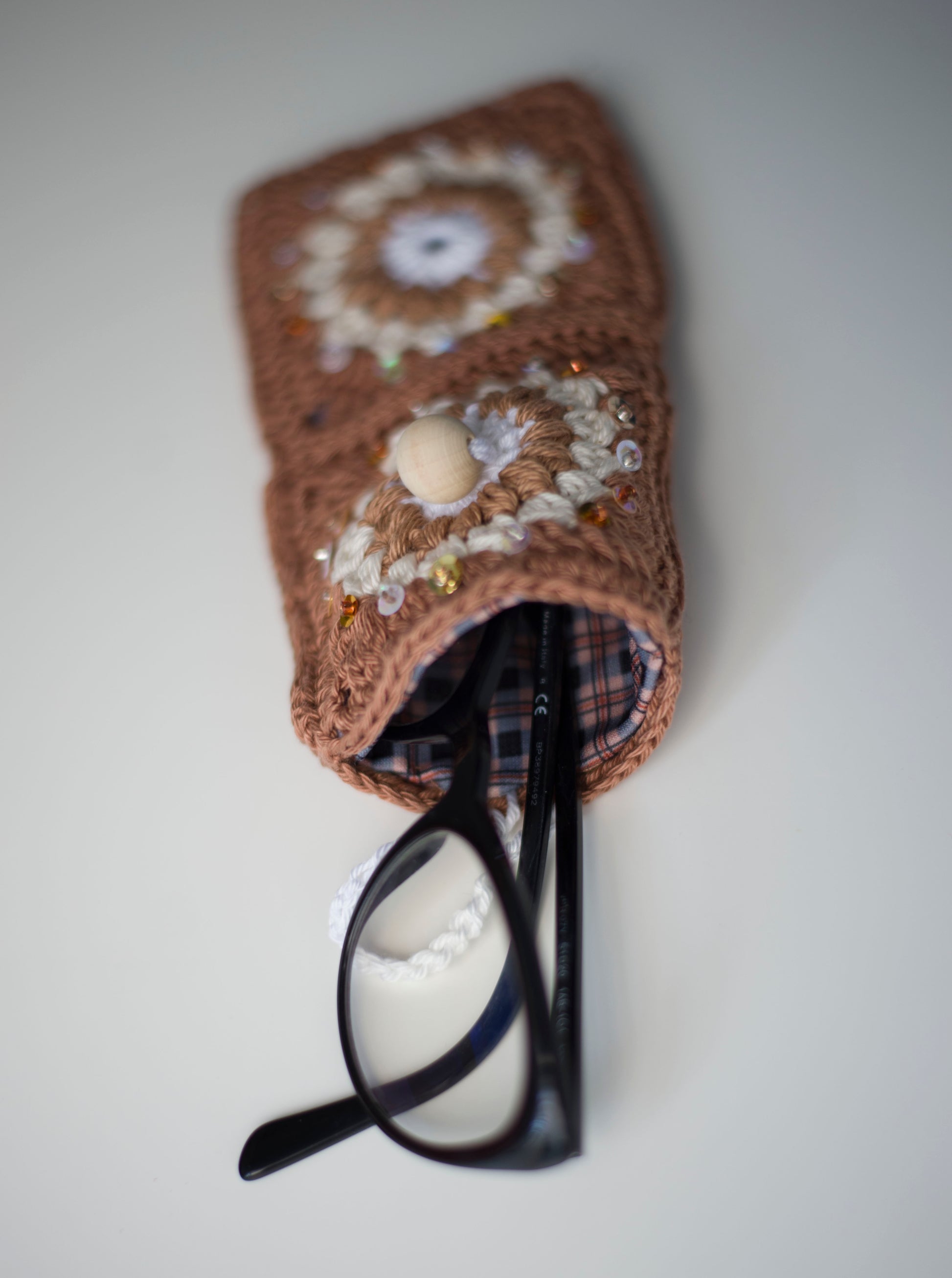 Handmade crocheted pouch for glasses, with fabric plaid inside, decorated with beads, closing with the matching button.