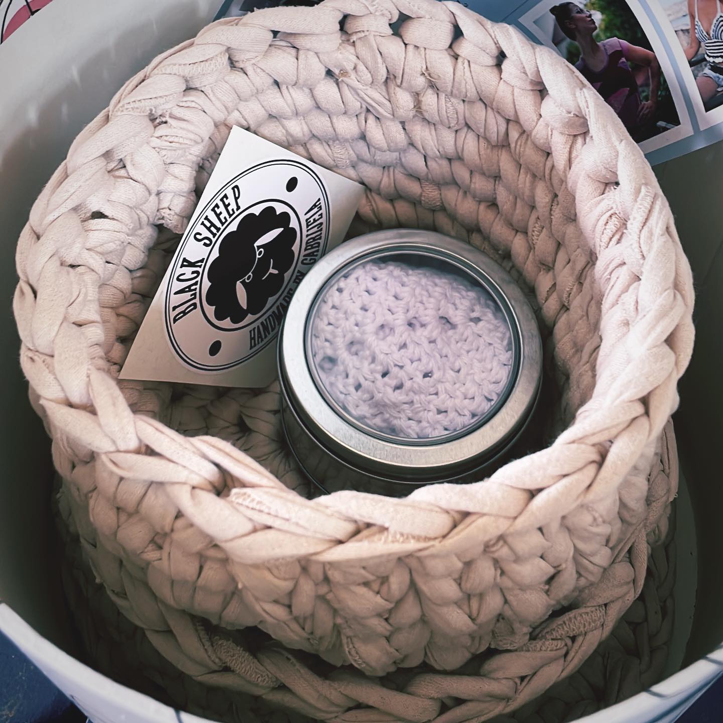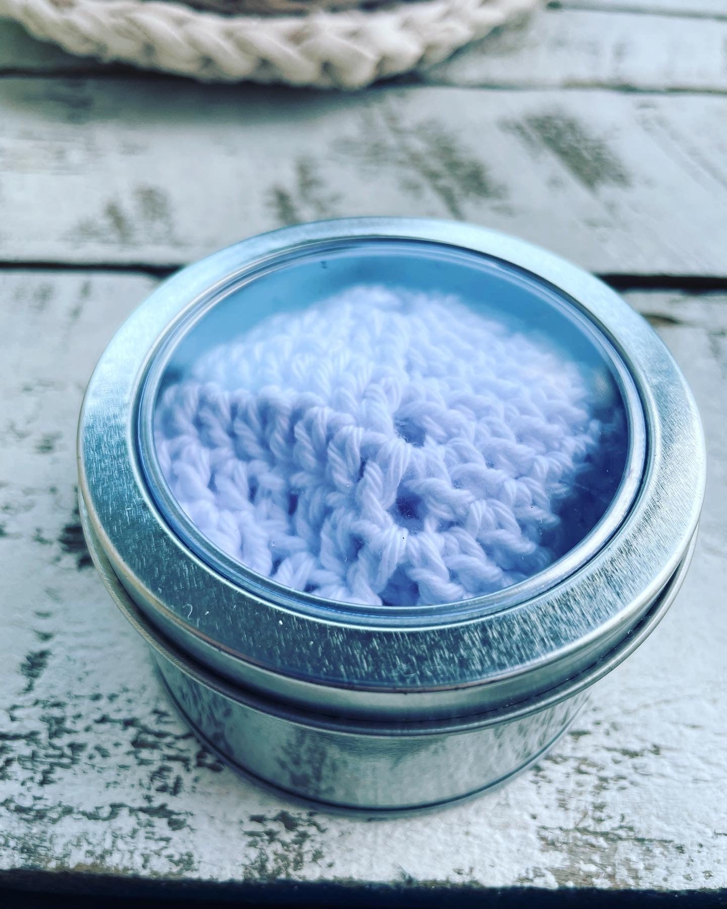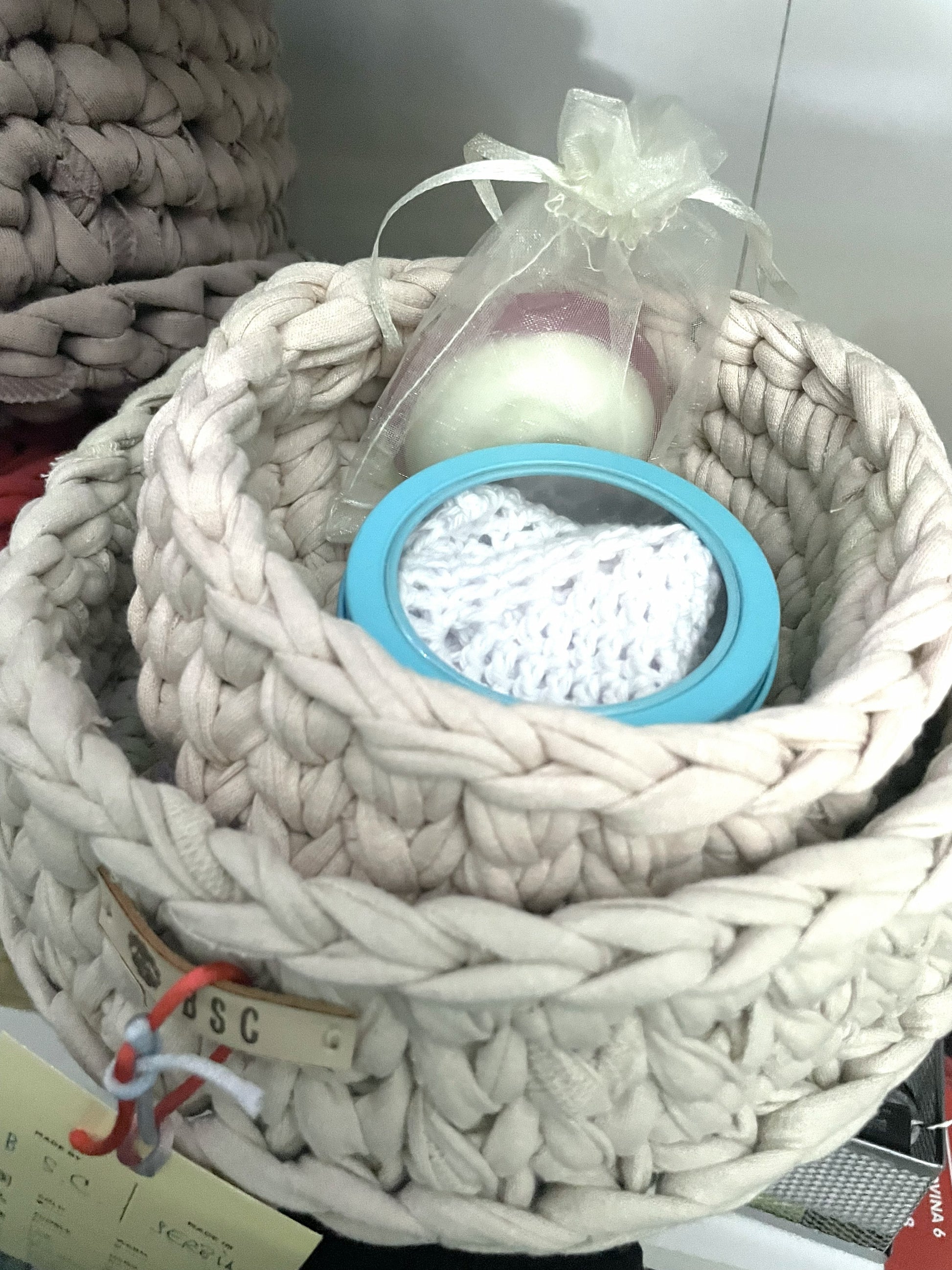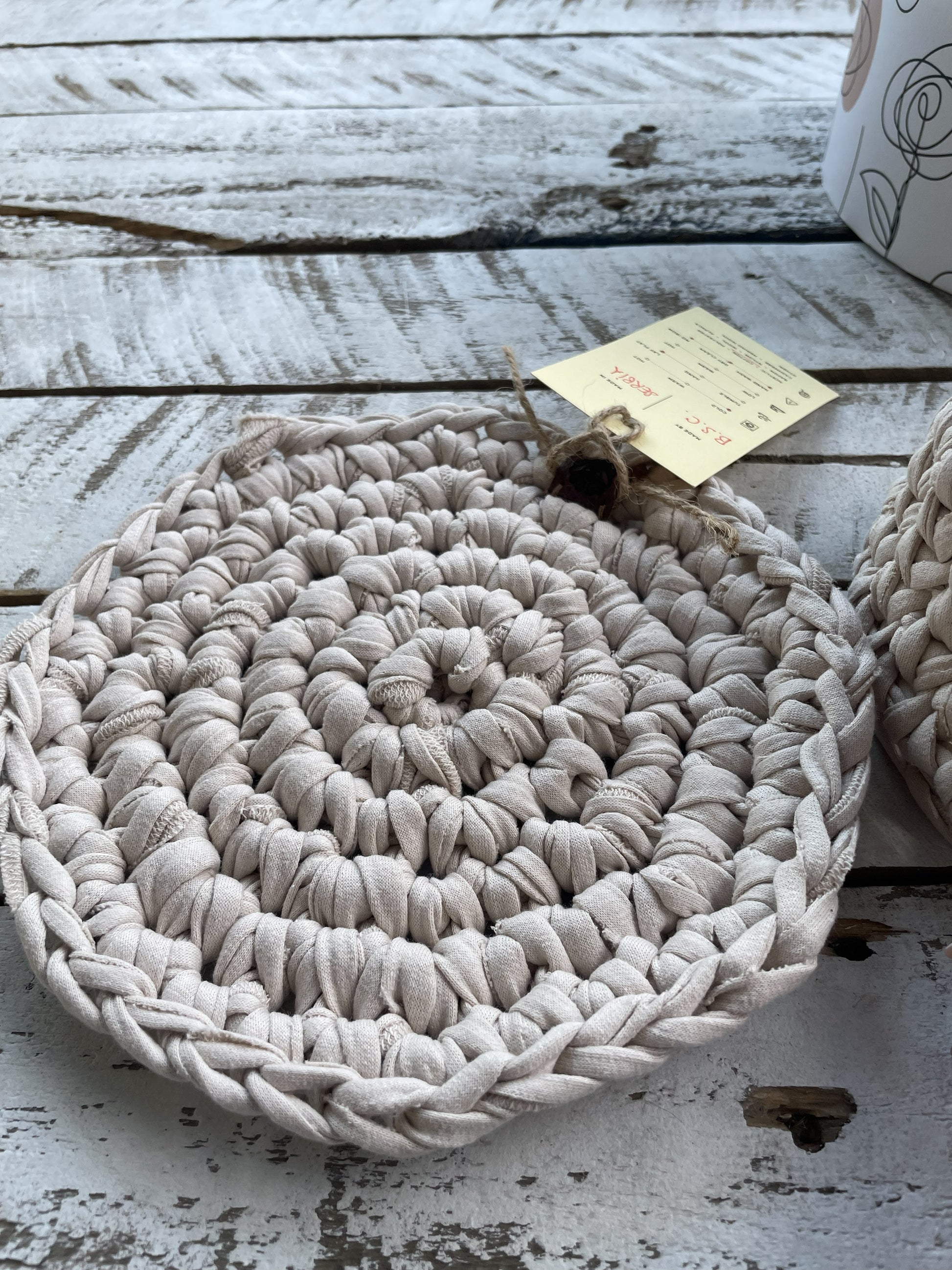 Handmade crocheted chunky T-shirt yarn set for bathroom accessories: deep bowl, pad and reusable 100% organic cotton tissue for make-up removal.